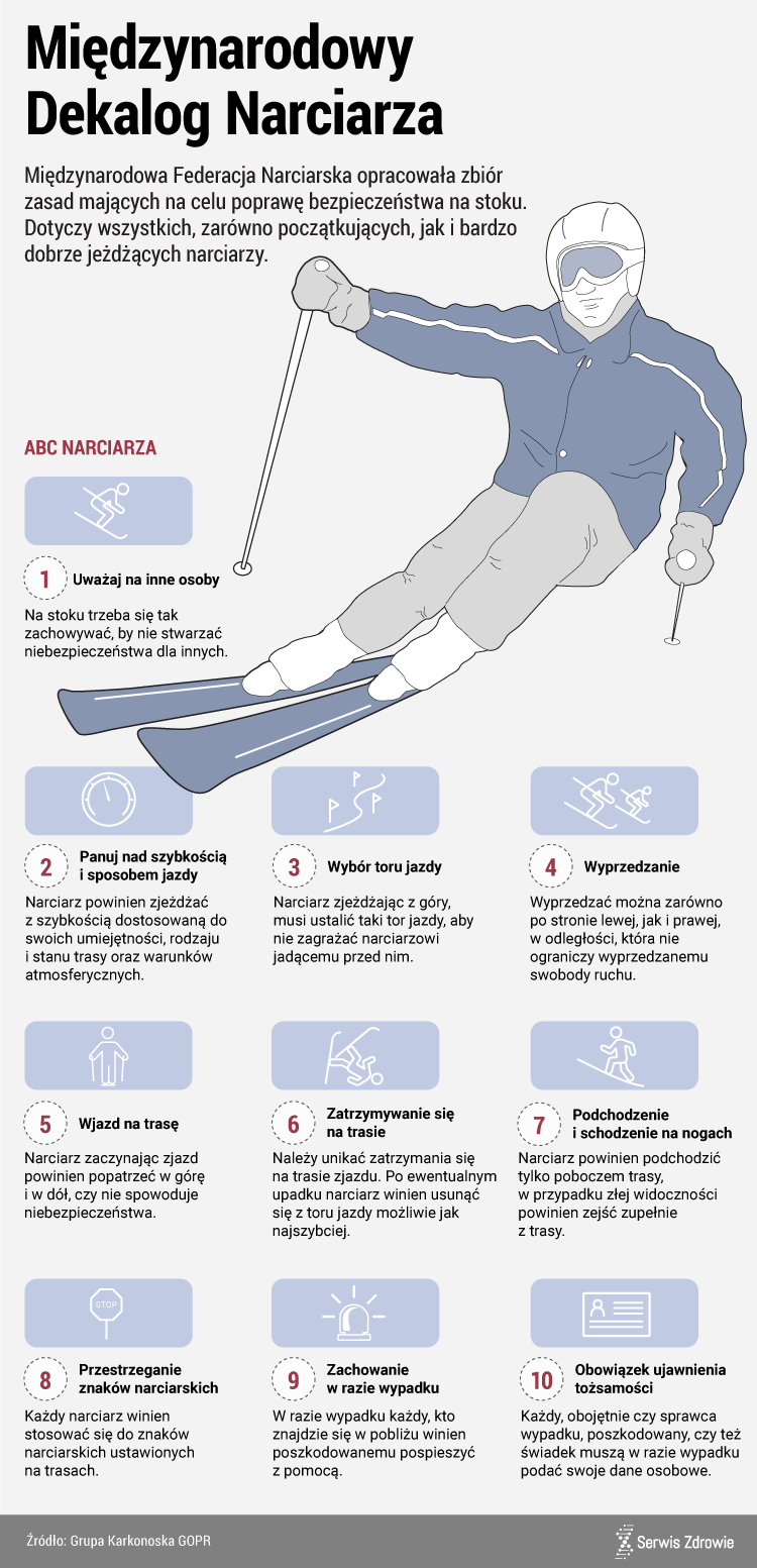 Międzynarodowa Federacja Narciarska (FIS) opracowała zbiór zasad mających na celu poprawę bezpieczeństwa na stoku. Dotyczy wszystkich, zarówno początkujących, jak i bardzo dobrze jeżdżących narciarzy oraz snowbordzistów. Warto je poznać, by na stoku poruszać się bezpiecznie.